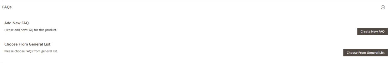 In the product edit page, a dedicated FAQ section is available, allowing the admin to manage product-specific FAQs directly from within the product form. This section provides two options: the admin can either create a new FAQ specific to that product or choose from the list of general FAQs previously created in the main FAQ listing. For product-specific FAQs, the admin can add a question and answer that will appear only on that particular product's page. Alternatively, the admin can select one or more global FAQs to associate with the product, enabling FAQ reuse across multiple products. This functionality provides flexibility to maintain both shared and unique FAQs across the catalog, enhancing the customer experience on product detail pages.