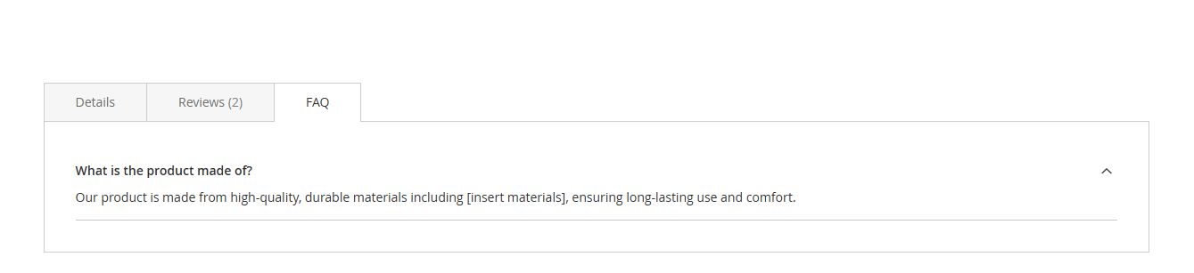 Once FAQs are assigned to a product—either as product-specific entries or by linking general FAQs—they will be displayed on the product page frontend. The FAQ section appears alongside other standard product tabs such as the Description and Reviews. This allows customers to quickly find answers to common questions related to the product without needing to contact support. Only FAQs with status set to "Enabled" and assigned to the current store view will be visible. This improves customer experience and can help reduce pre-sale inquiries by providing instant, relevant information directly on the product page. It is compactible with Luma Theme.