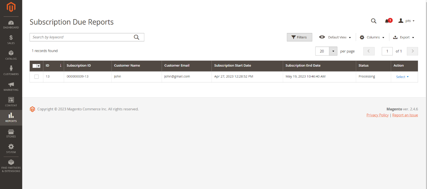 In the subscription due report, you can access information about customers who have overdue subscription payments. It provides details about the customer, the amount due, and the subscription details.