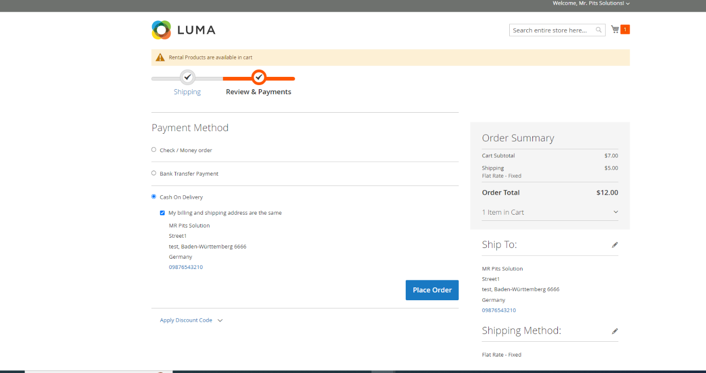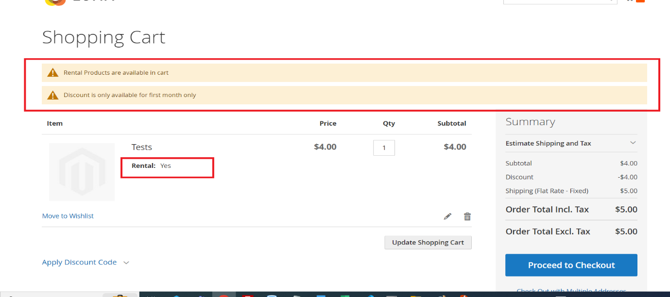 On the cart page, if there are rental items in your cart and discount is available in a cart, a message entered by the admin will be displayed. This message serves as an indication that rental items are present in the cart. Additionally, the rental products will be marked with a "Rental: Yes" label to easily identify them as rental products.