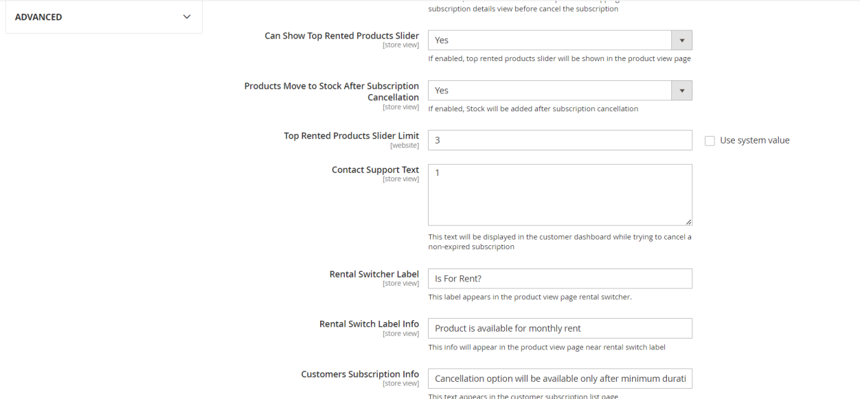 From the admin backend, go to Stores > Configuration>PITS Configuration > Rental Subscription.