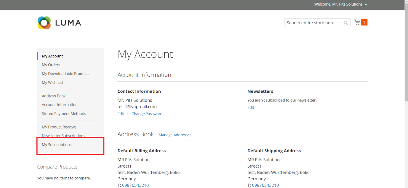 In the subscription view page, you can find the shipping address details, paymentmethods, and the products included in the subscription.
