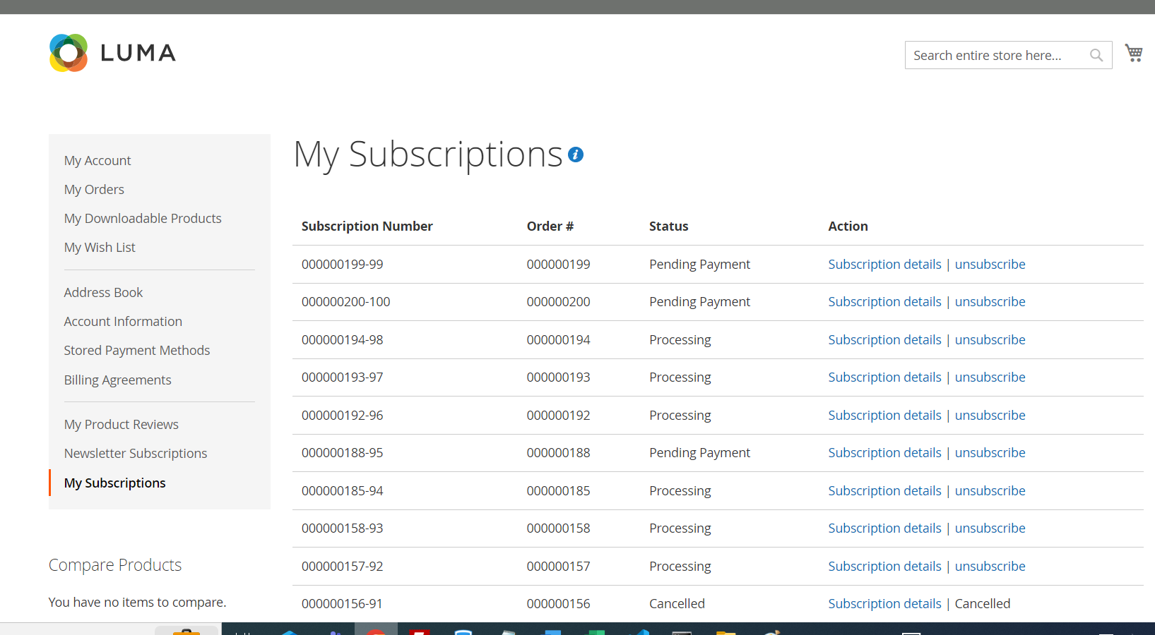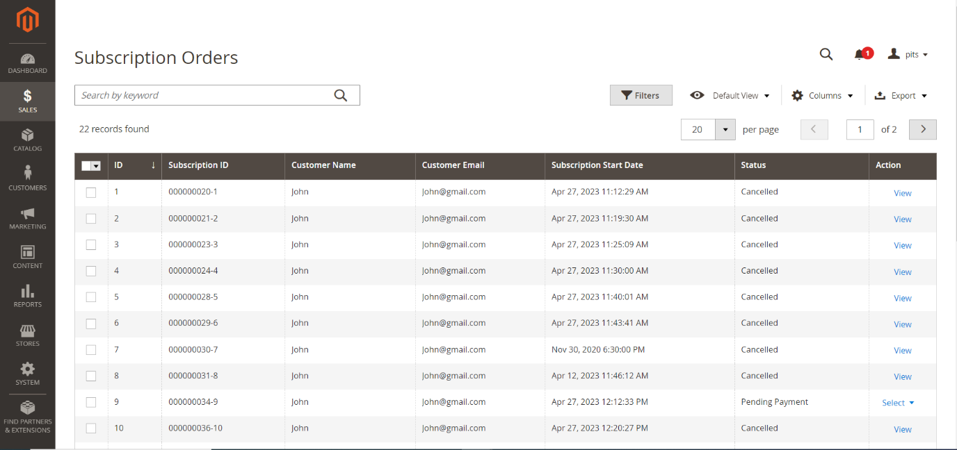 On this page, you can view and manage subscription orders, including details such as subscription ID, start date, status, and customer information. You can easily view and cancel subscriptions.