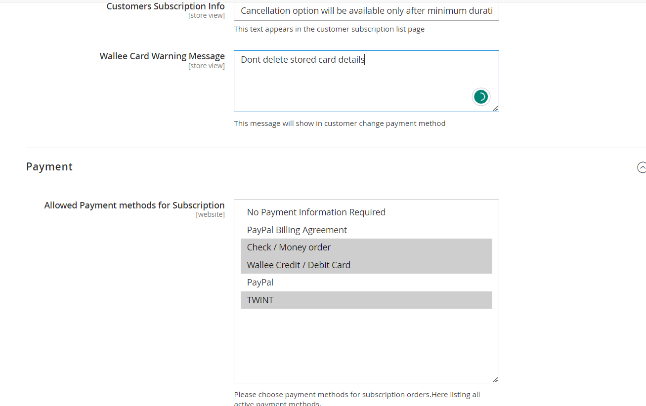 - Payment Options: We can set allowed payment methods for subscription Order.