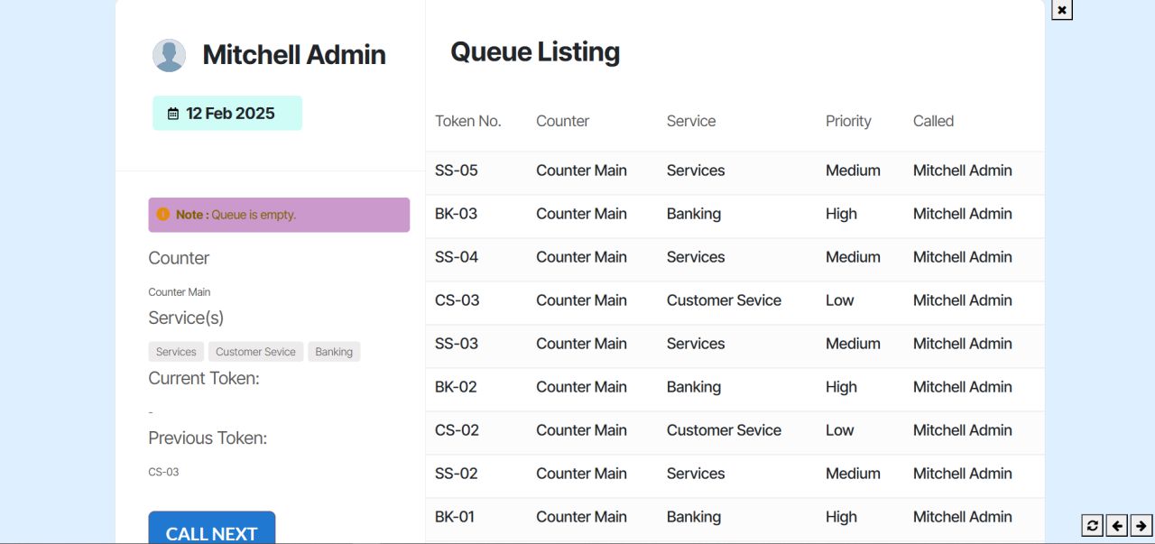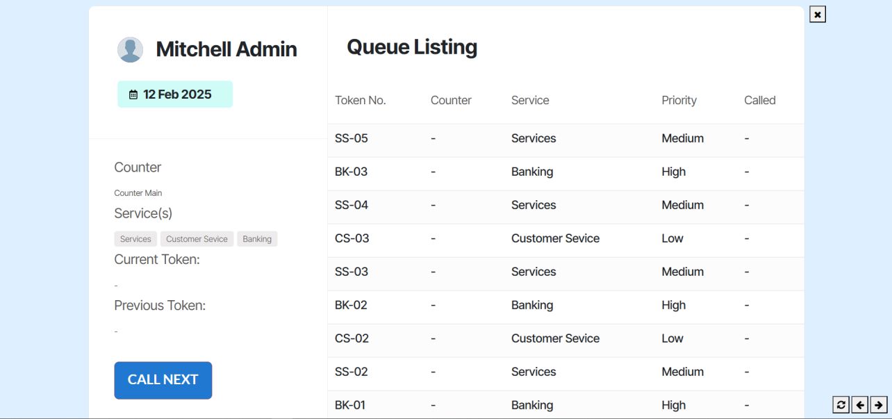 - Call Next Token Button: The calling of the next token is determined by the priority assigned to the service. If priorities are set, the system will call the highest-priority token next. If no priority is applied, the system will use the FIFO (First In, First Out) method to call the next token in line.