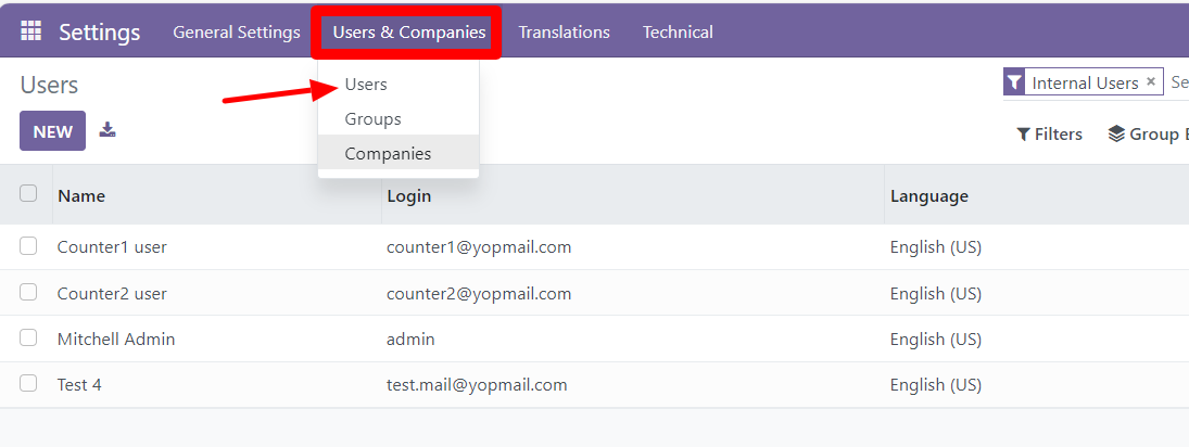 - To create new user and to assign the user role, navigate to Settings > Users & Companies > Users. Refer Fig.15 for more details.