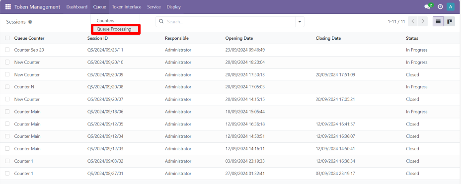 Queue Processing menu list the details of session against all the counters. Session details such as Counter, Session Ref., Session Opening and closing time and Status are few of the columns displayed in the List view.