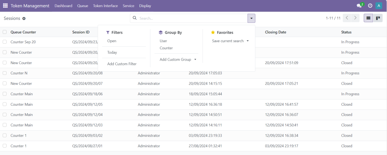 Both Admin and Counter users have access to view the status of Token Interface sessions. However, Admins can view the status and details of all sessions across the system. In contrast,Counter users can only view the status and details of sessions for which they are designated as the responsible user.