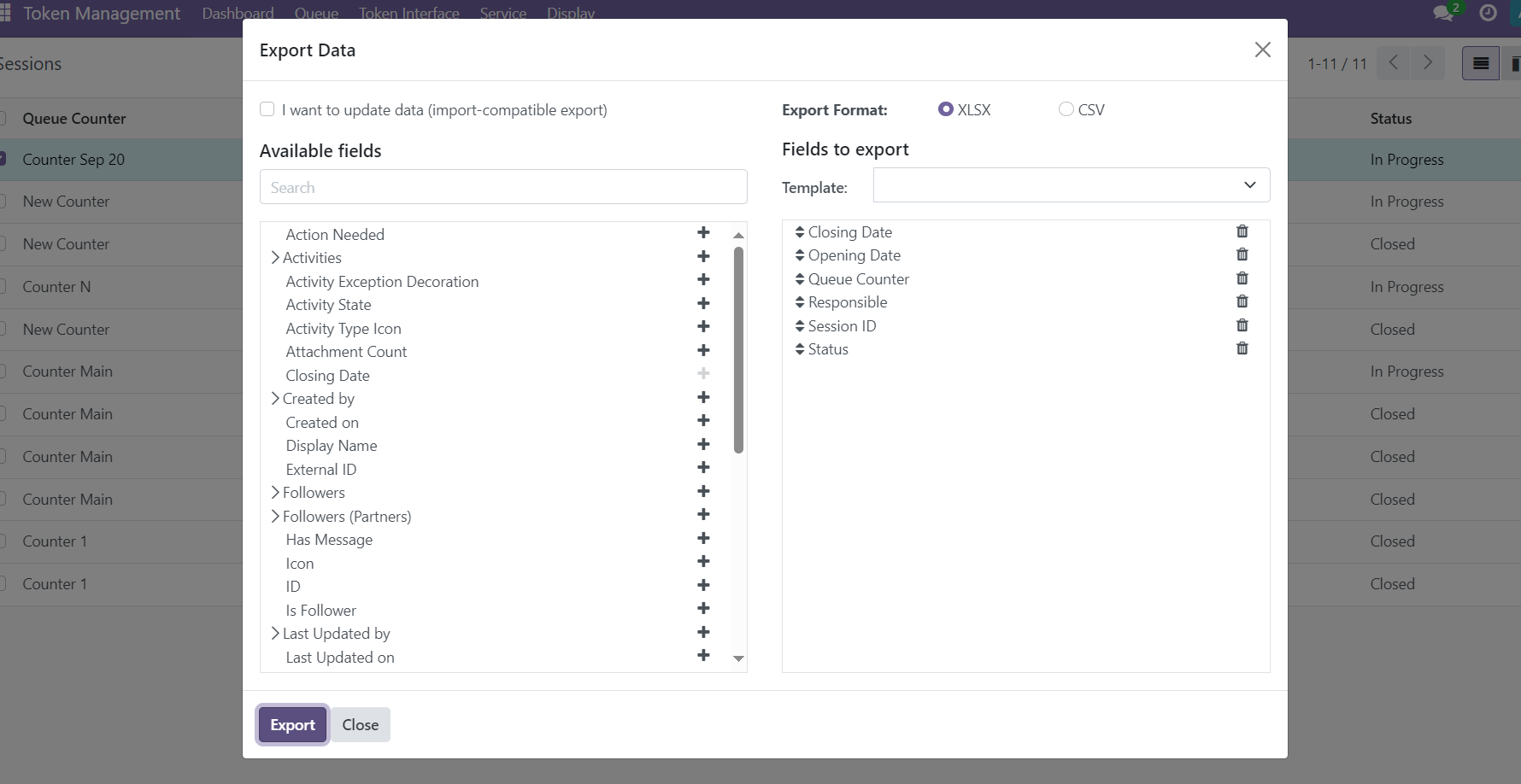 - Users can customise the export result by adding new field or by deleting it to get the required result they want. They can either export into xlsx or csv format.