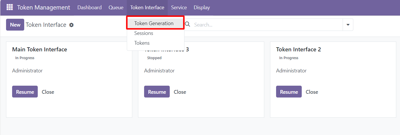 Token Interface menu is used to view and create a new token interface. Already created interfaces will be listed here. The generated tokens are displayed on the counters, providing a clear view of the current queue and token statuses