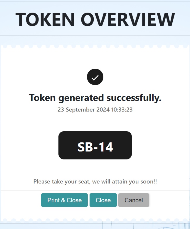 - Print & Close: Generate a printout of the generated token for reference and redirects to the Token Interface page.