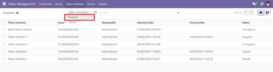 This session view contains Token interface name, Session ID, Responsible, Opening - closing date and status.