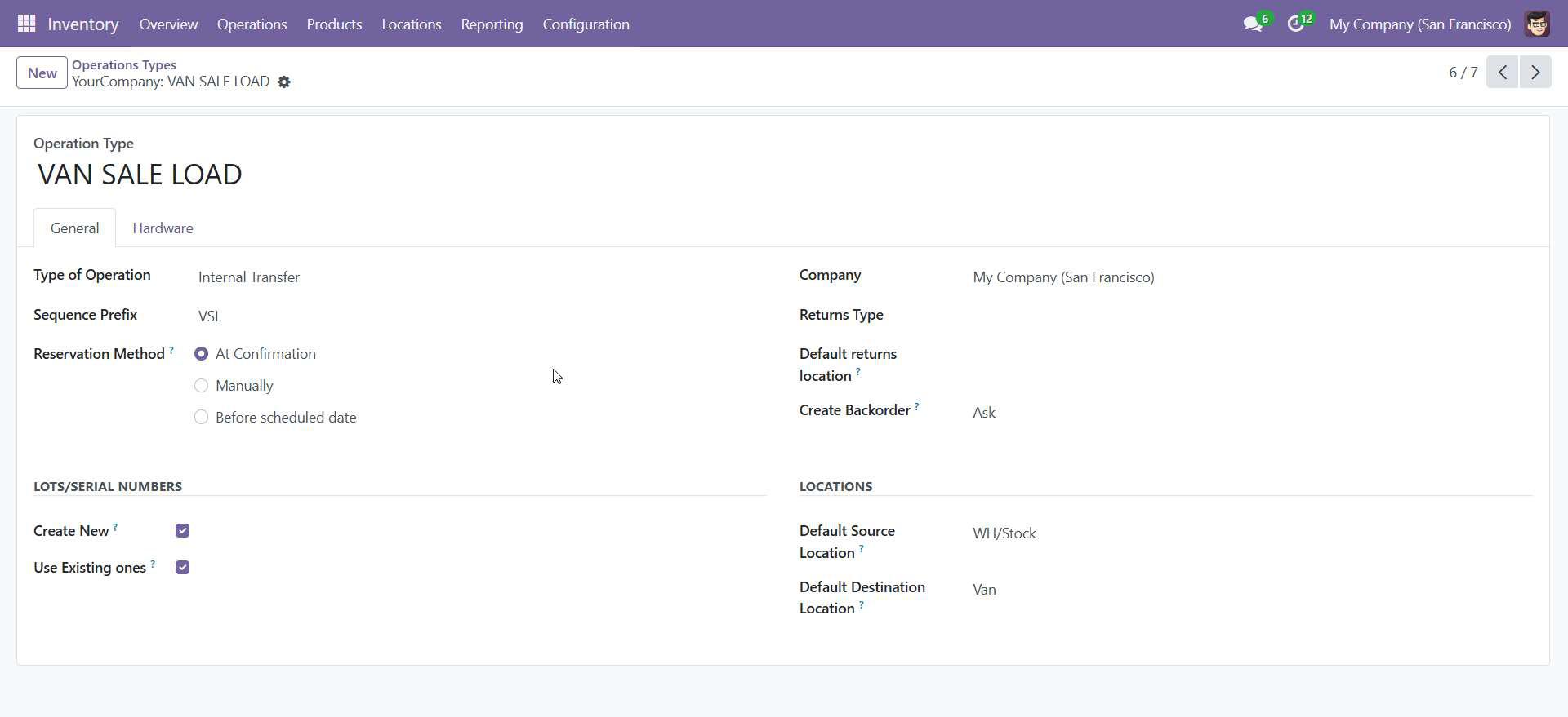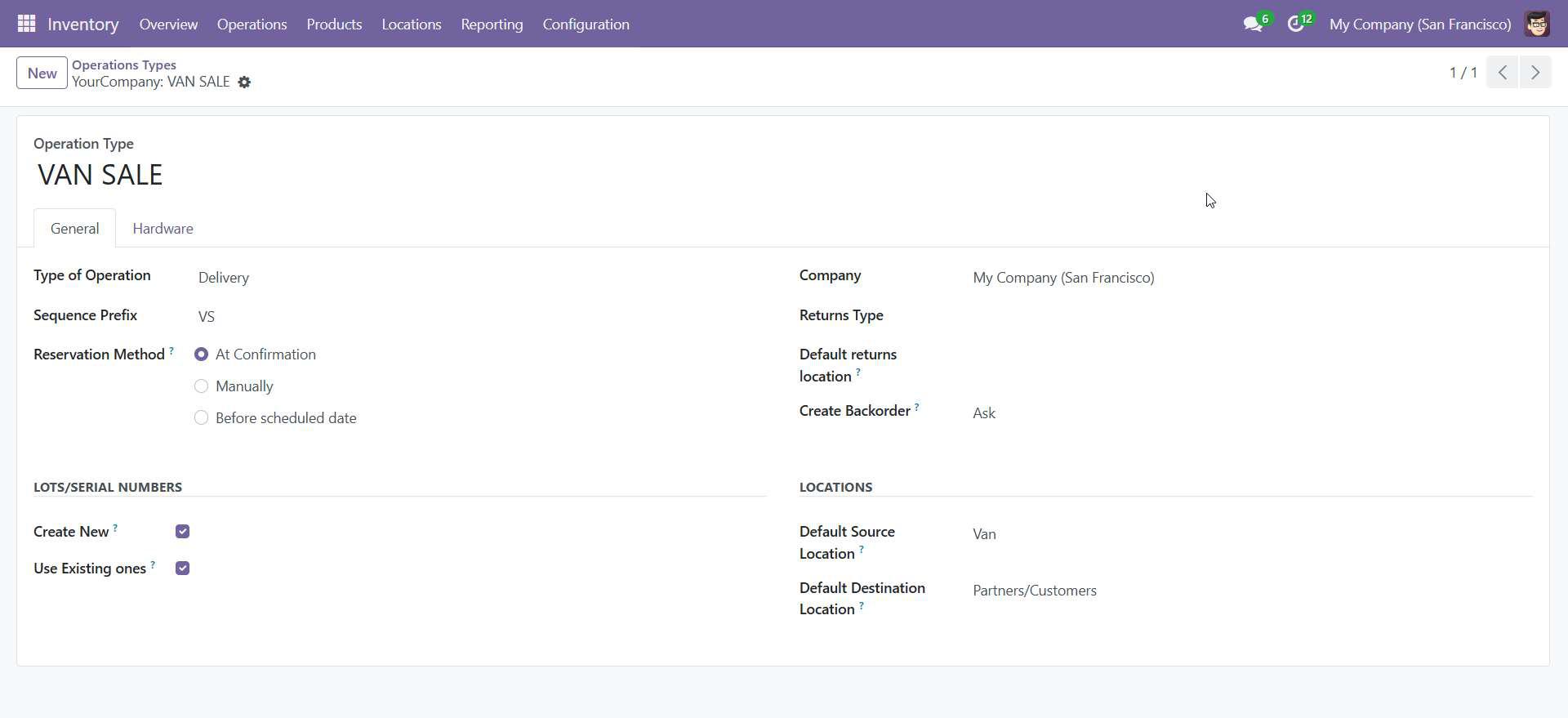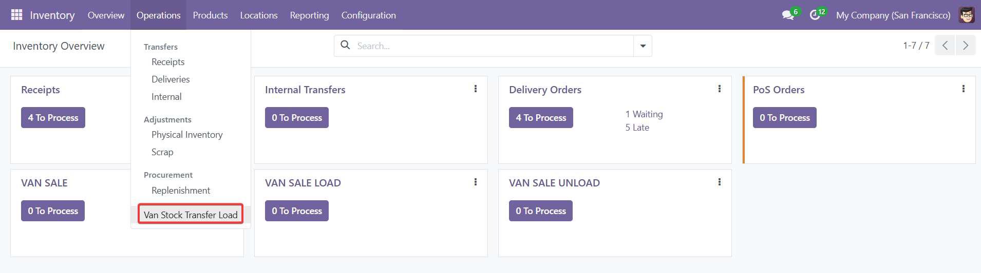 - This operation type is for stock move from warehouse locations to the VAN prior to the beginning of sales