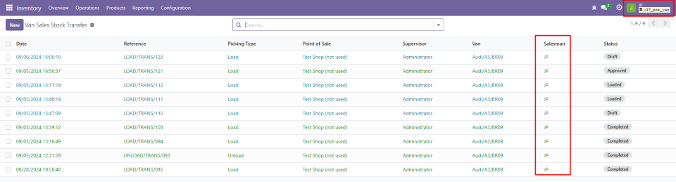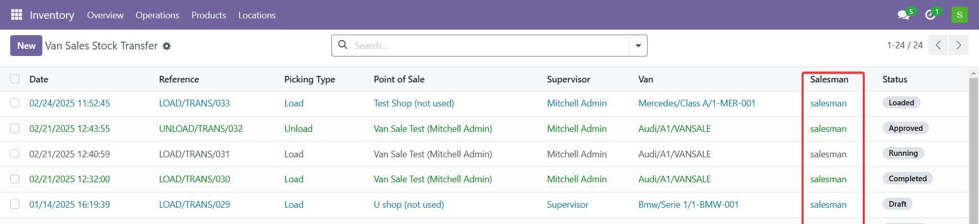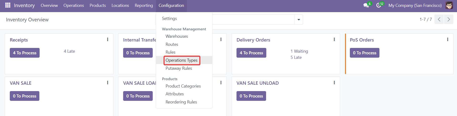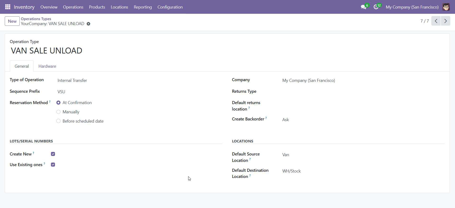 - This operation type is for stock move from warehouse locations to the VAN prior to the beginning of sales