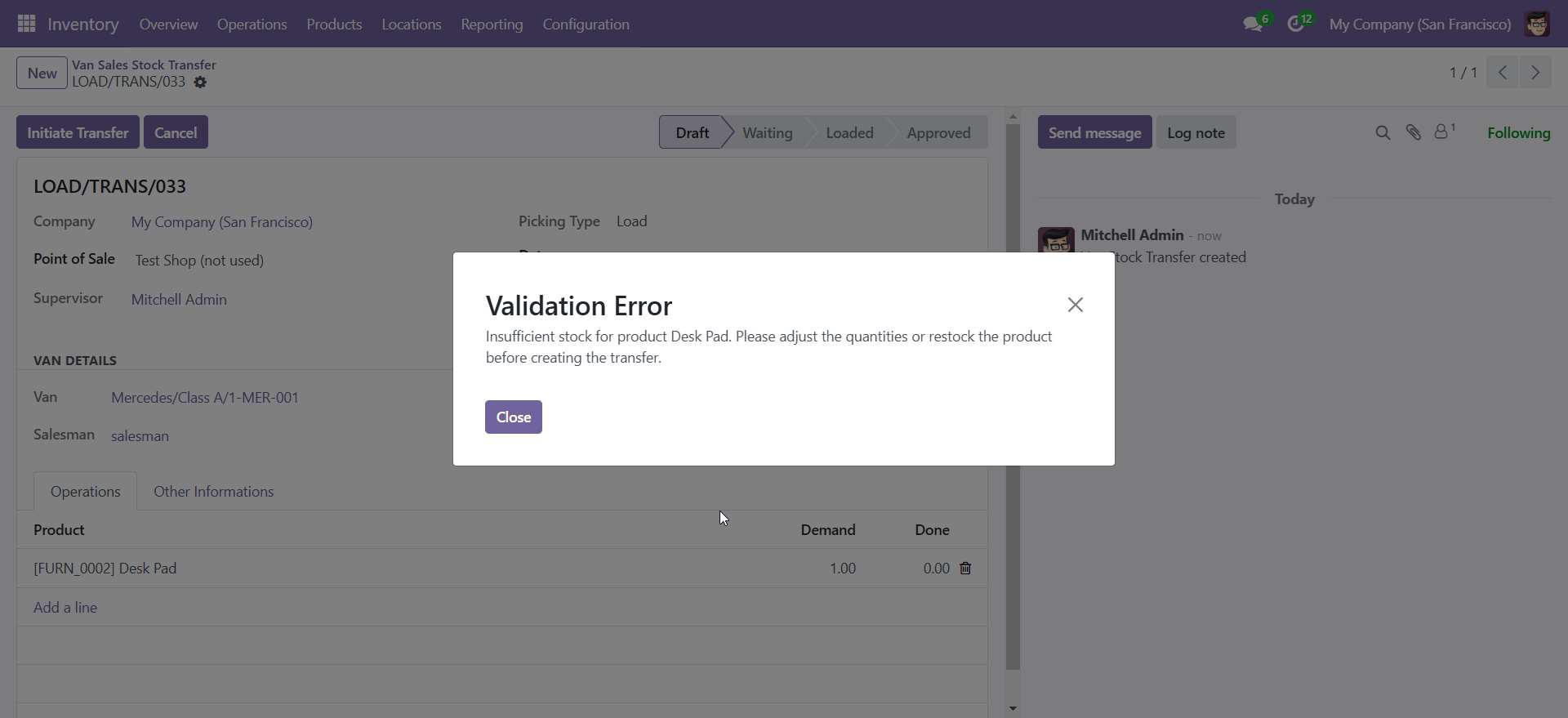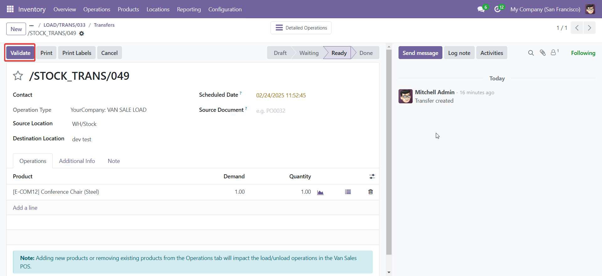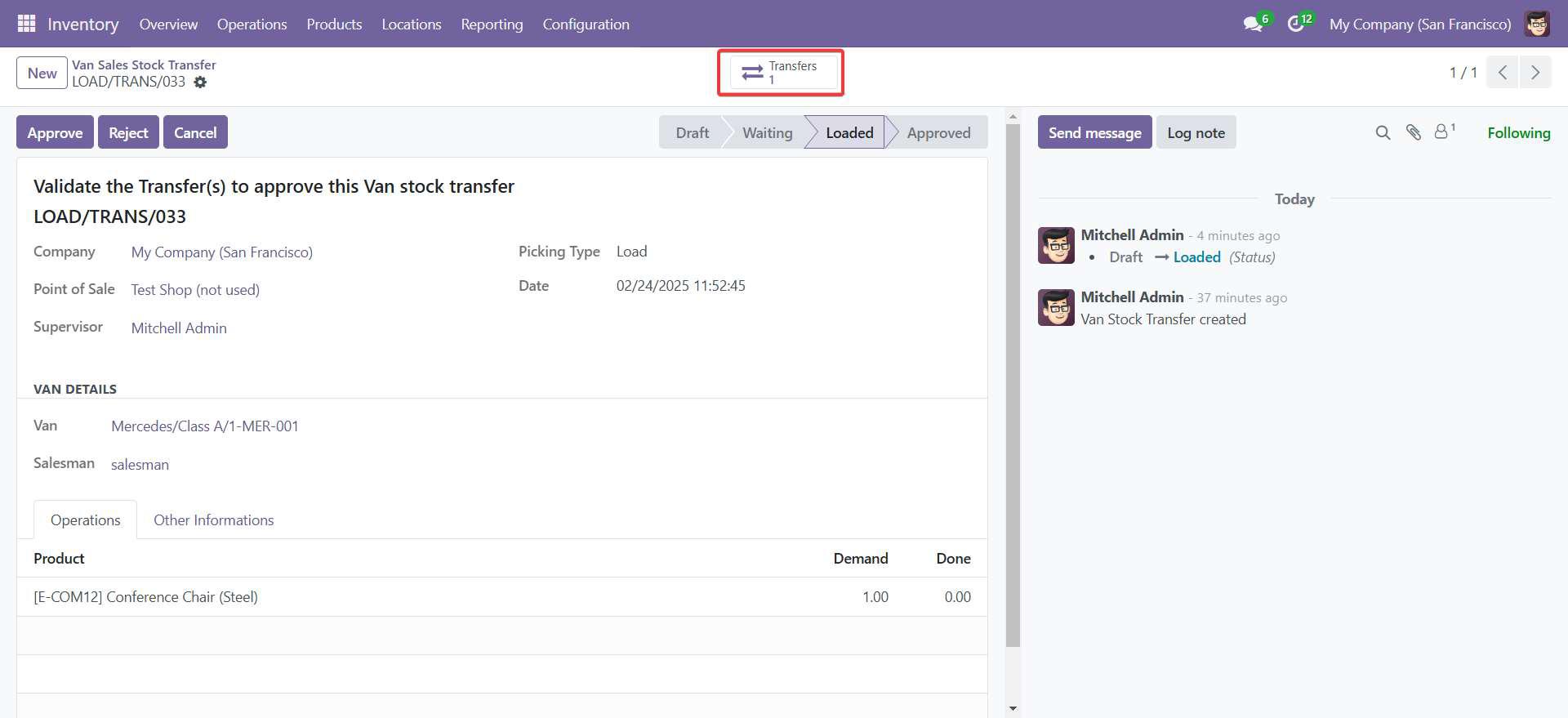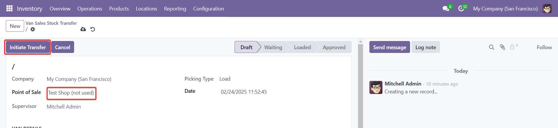 Screenshot 19: Van point of sale – View the created transfer if we have enough stock then transfer will be initiated: