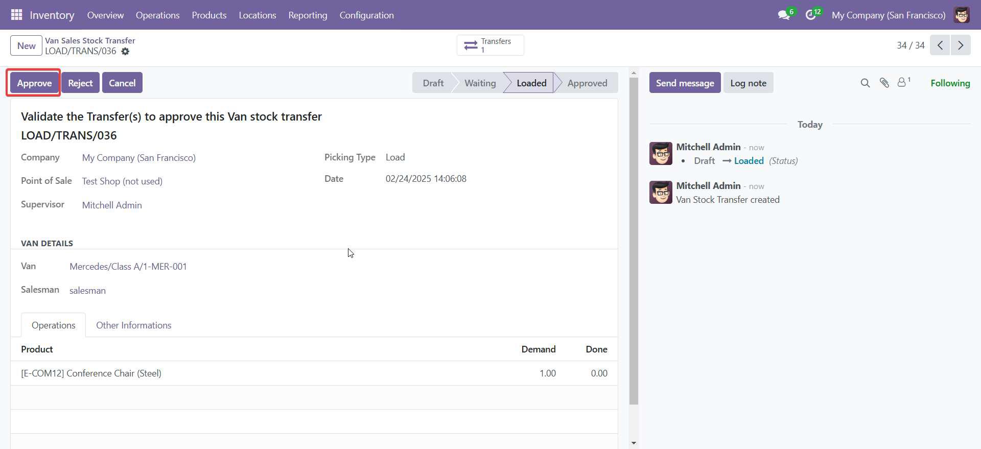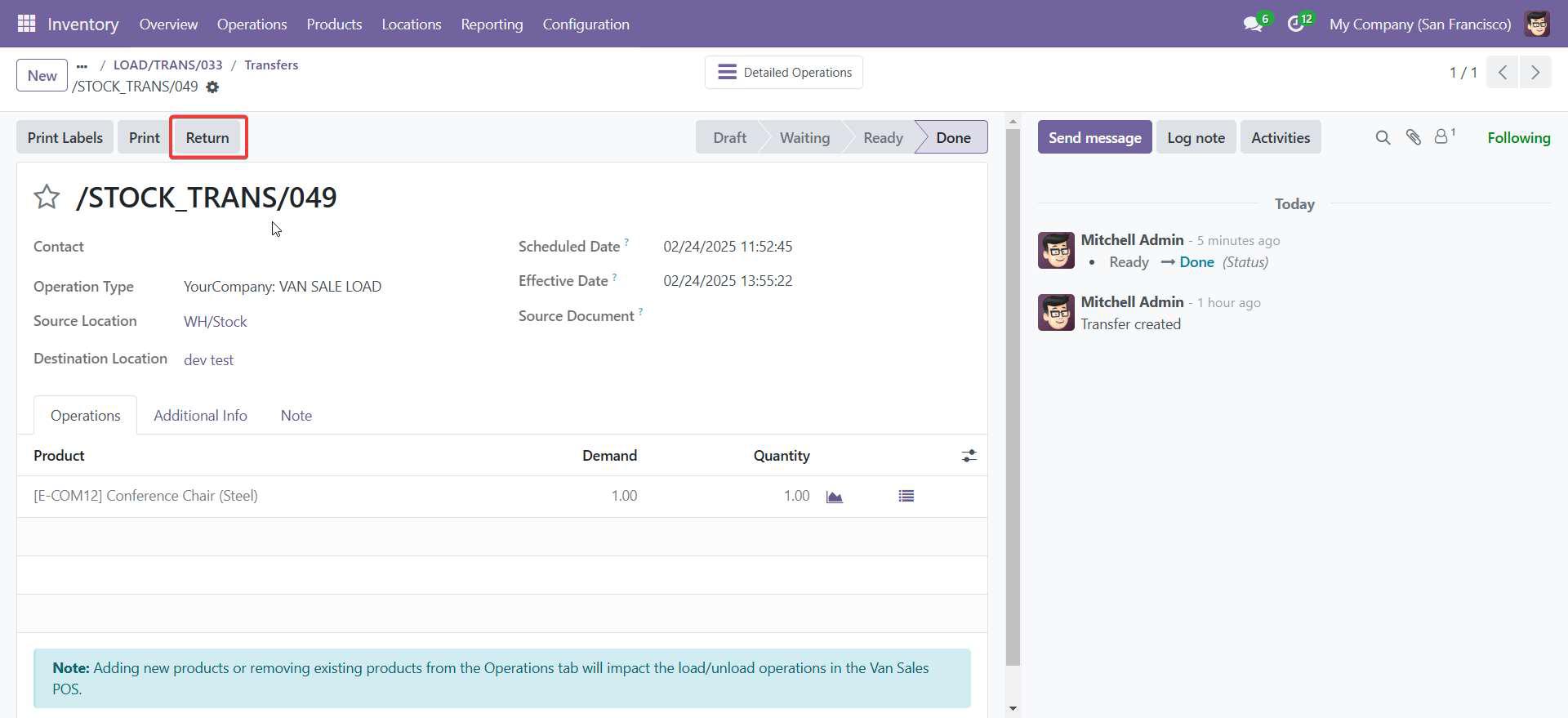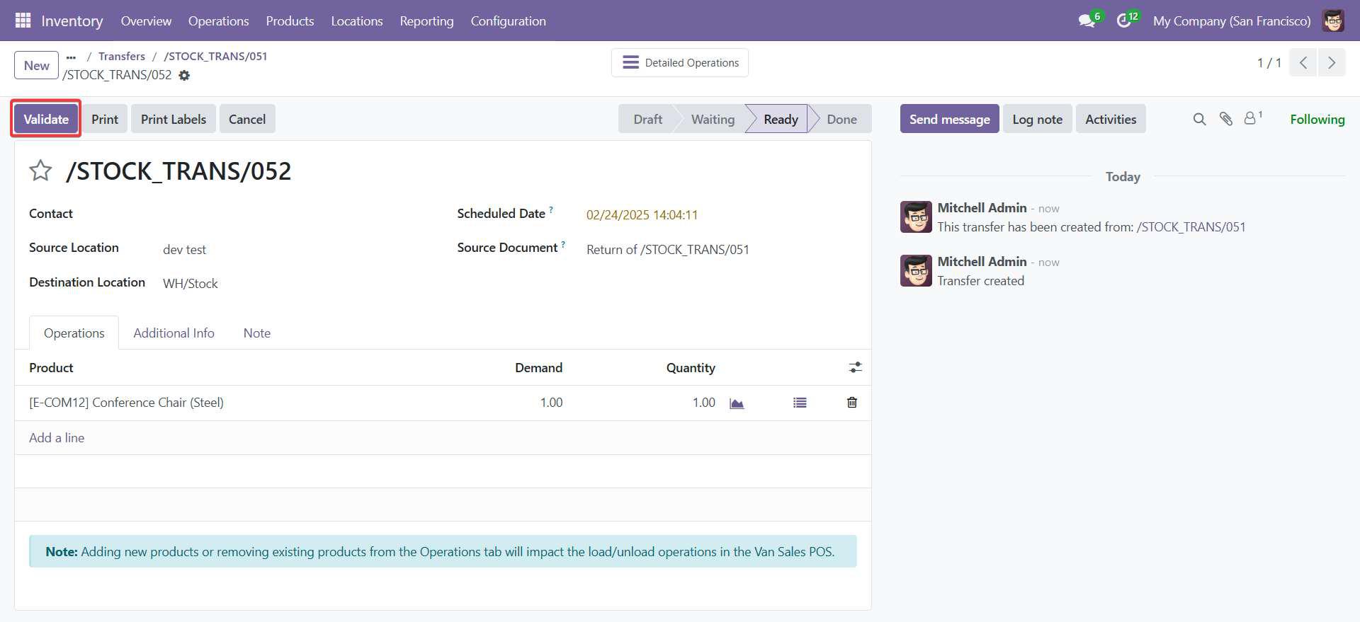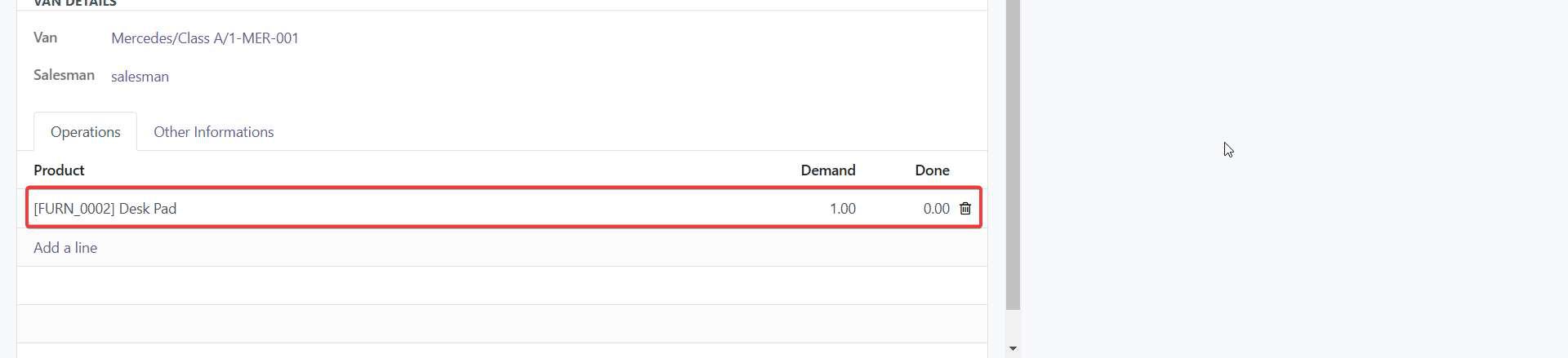 - Add products to the van – Van stock transfers are restricted to storable products only.