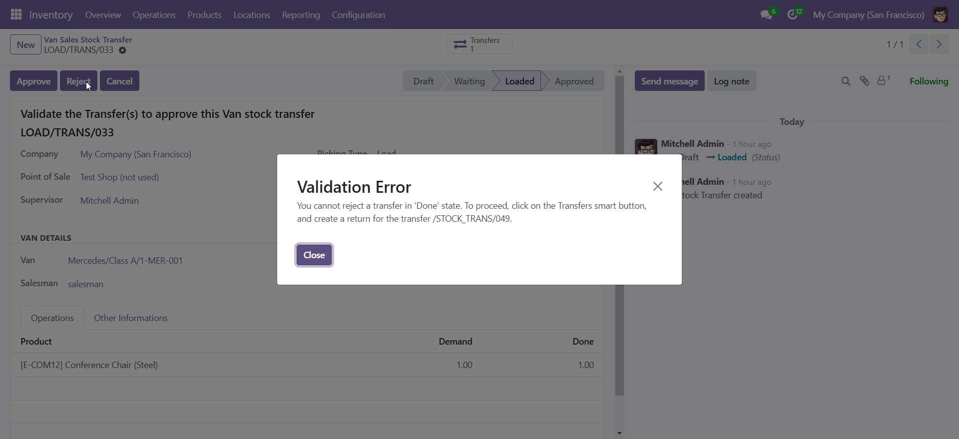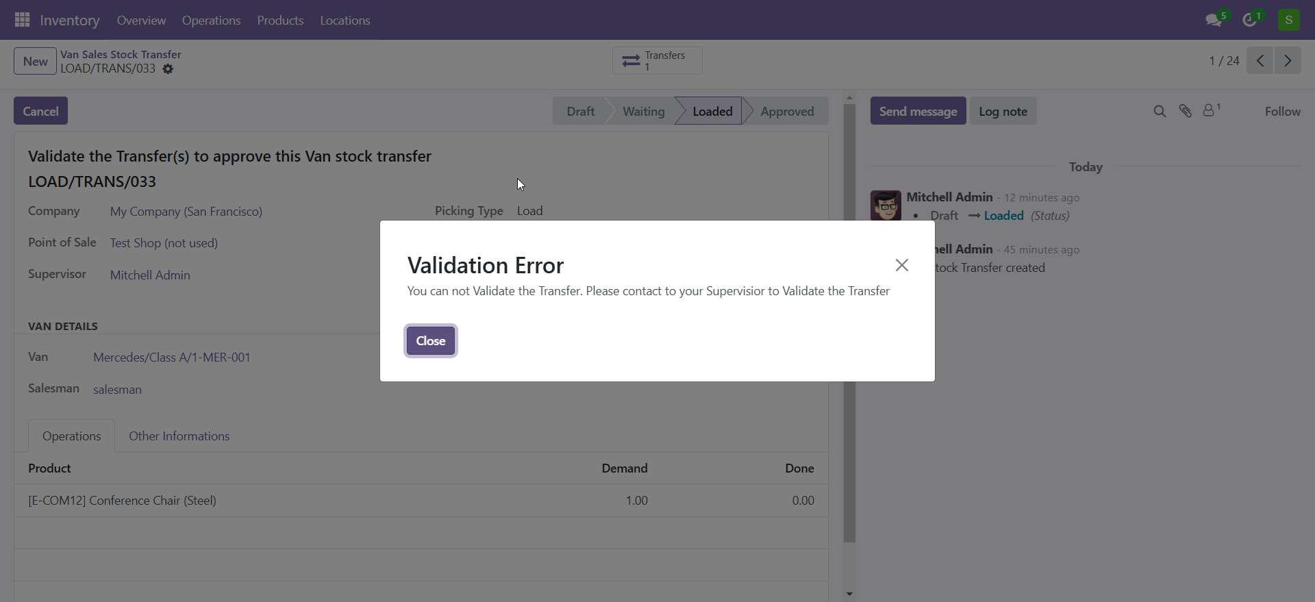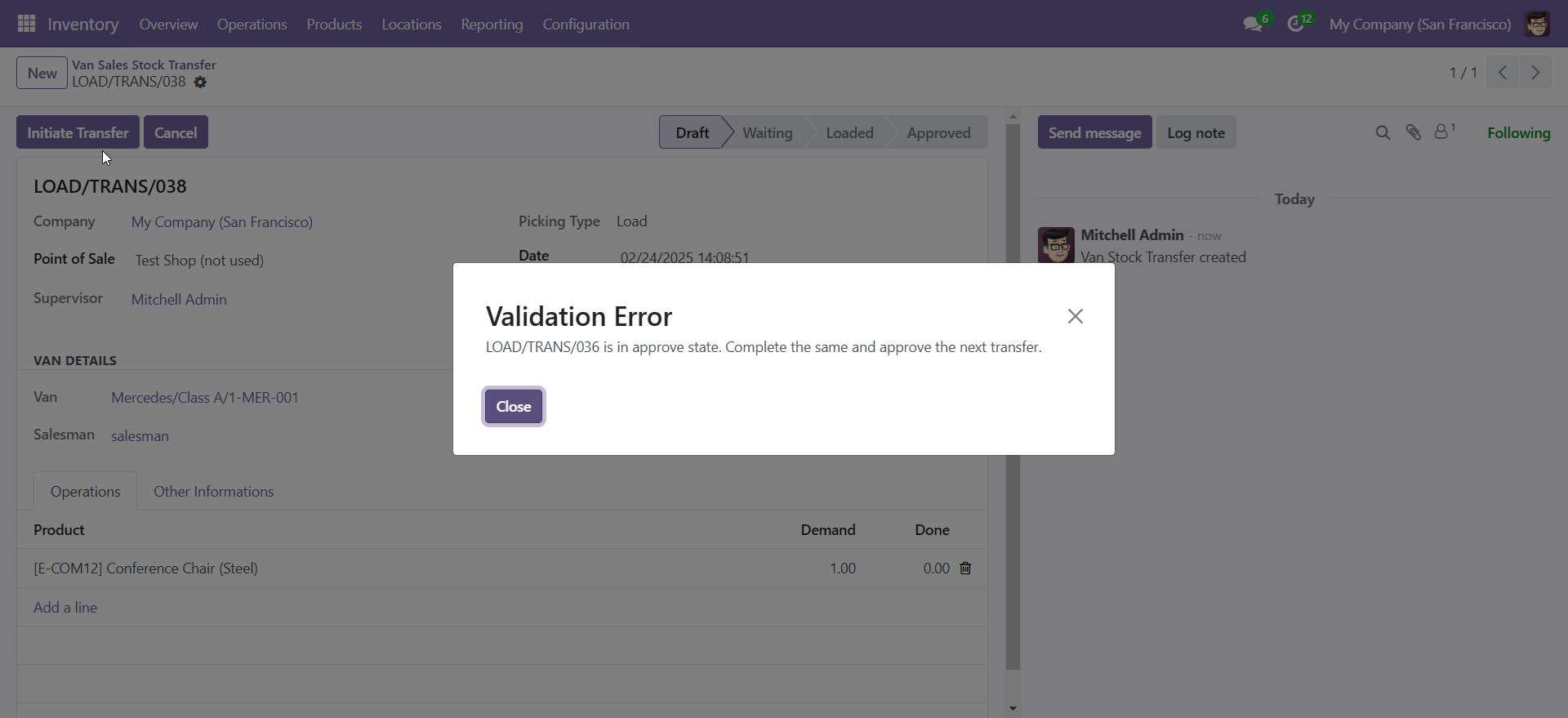 Screenshot 27: Once the Van Stock Transfer Load is approved then you cannot create another Van Stock Transfer Load for the same session it will raise validation. You need to complete the previous Load.