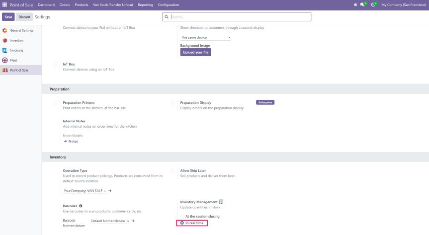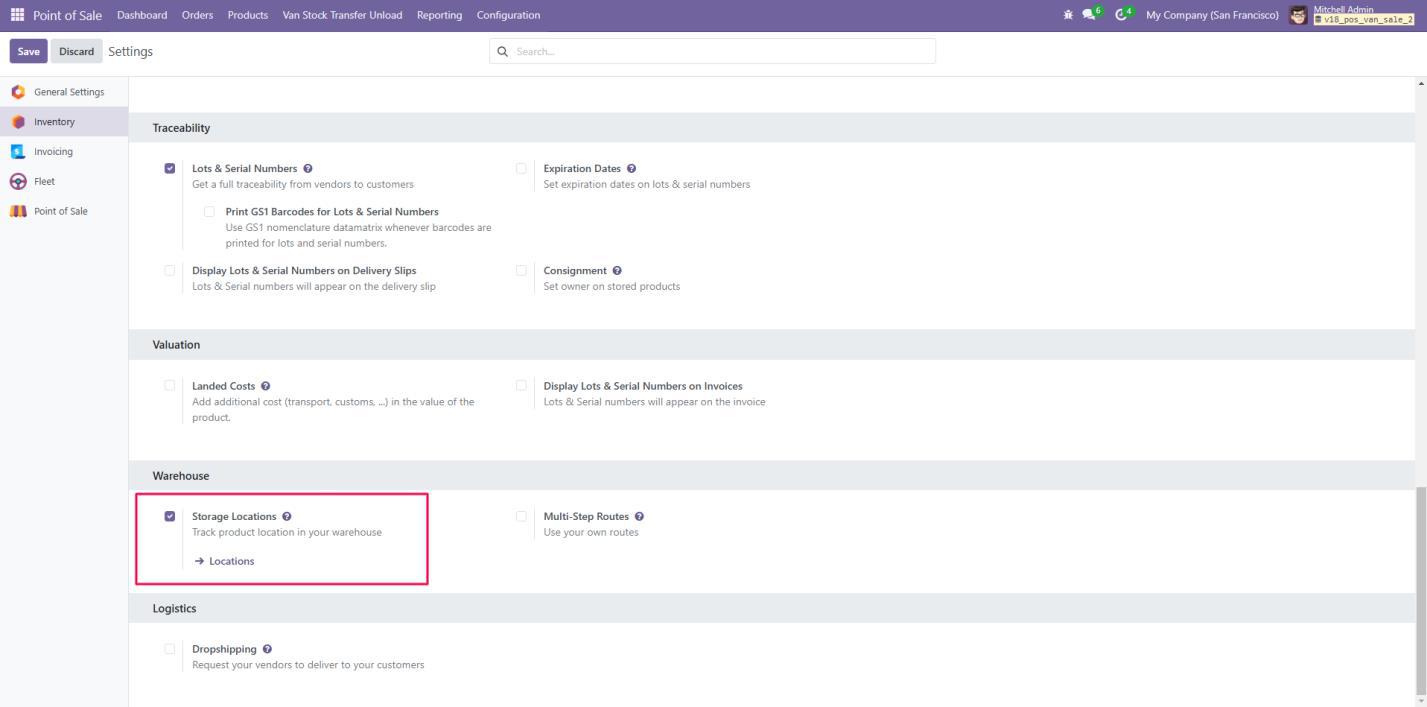 Go to the Inventory module and activate the necessary settings for van stock management.