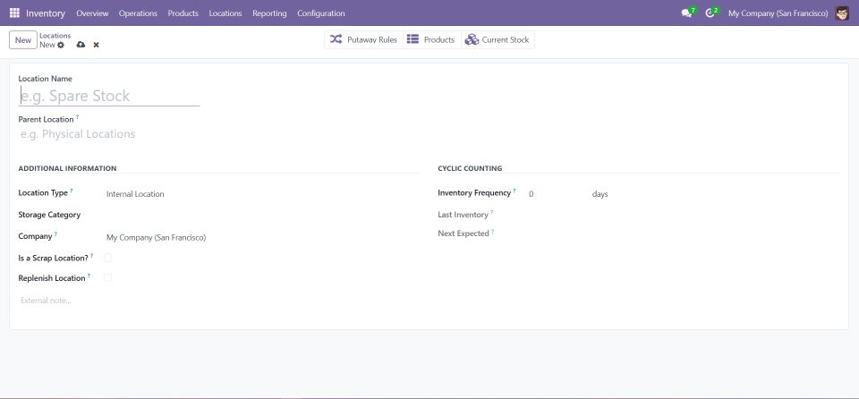 • Location Type: Specify the type (e.g., internal, customer, supplier).