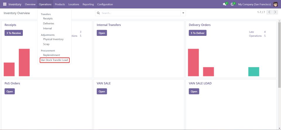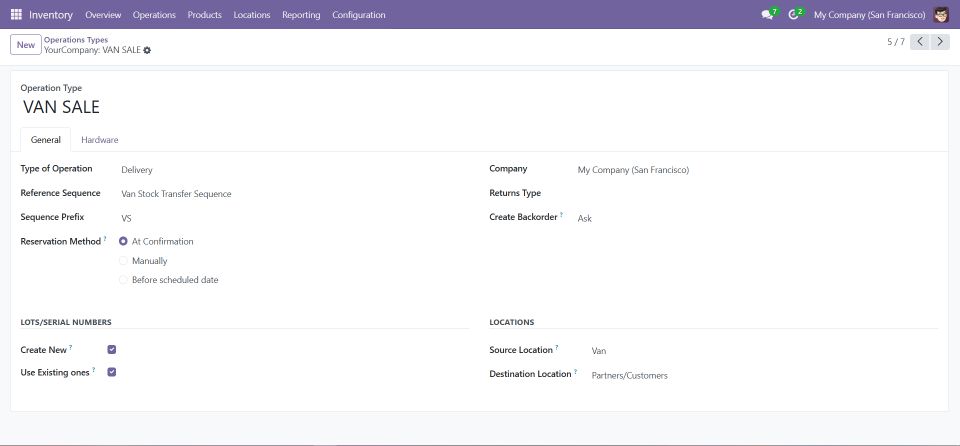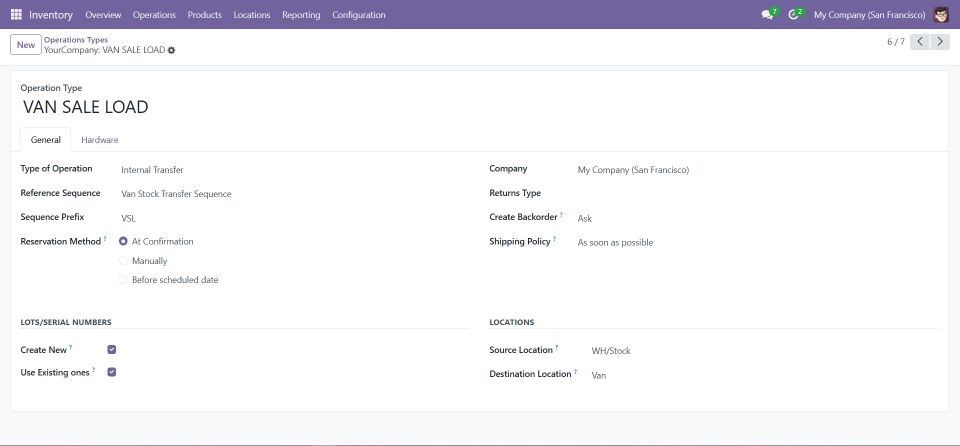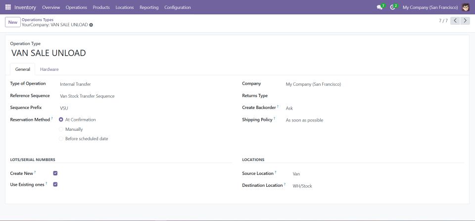 This menu allows you to configure and manage different operation types, such as loading and unloading stock for van sales.
