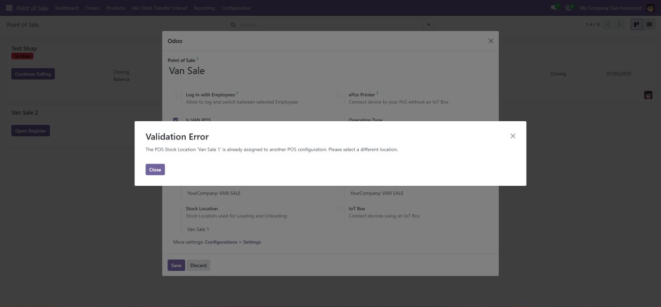 Screenshot 15: Van Point of Sale - Validation displayed if same Van is configured to more than one POS