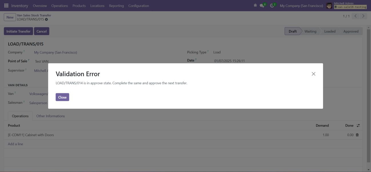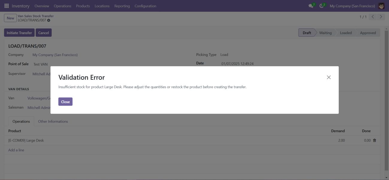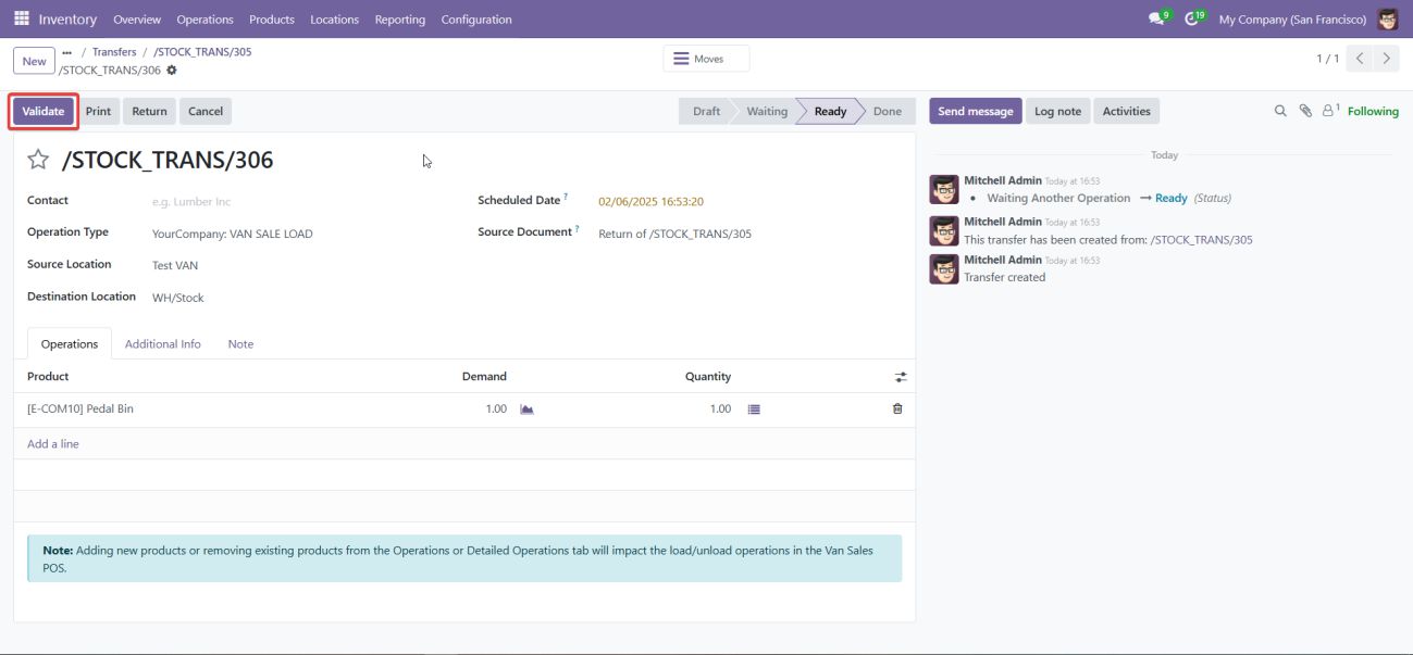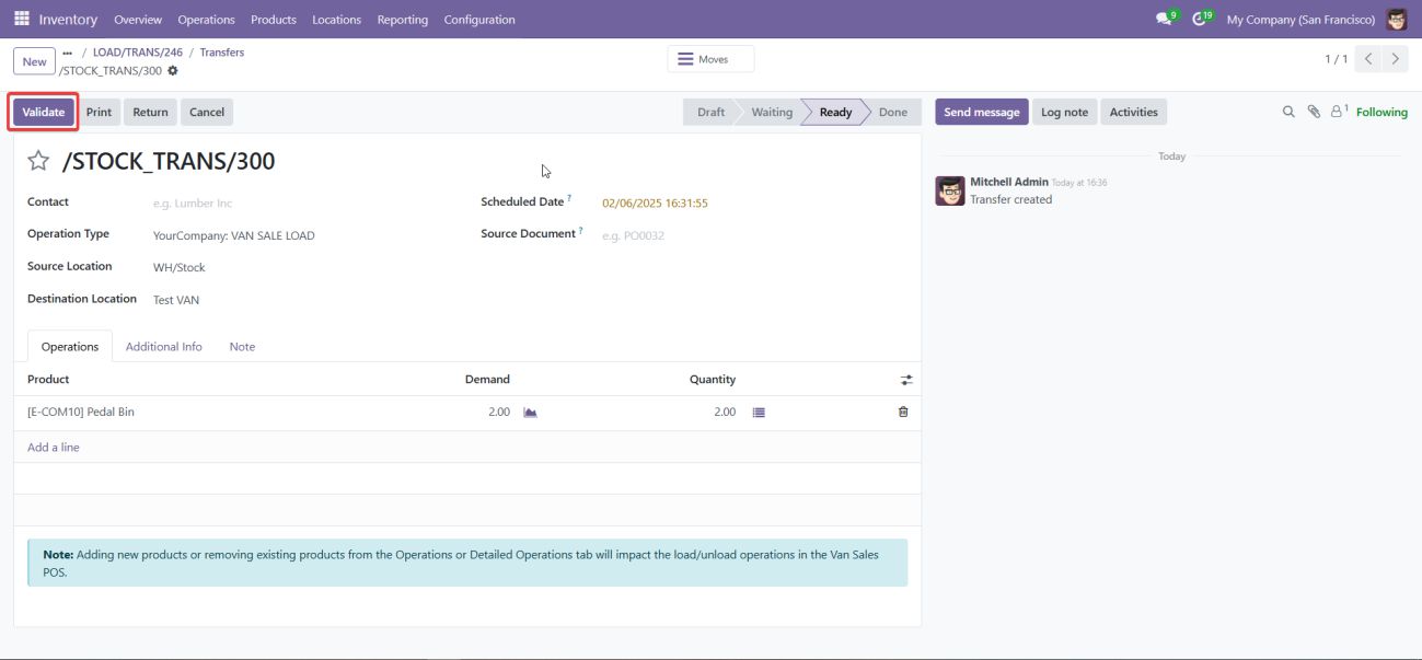 Ensure that the load is validated before being transferred. This step ensures that the stock is properly allocated to the van.