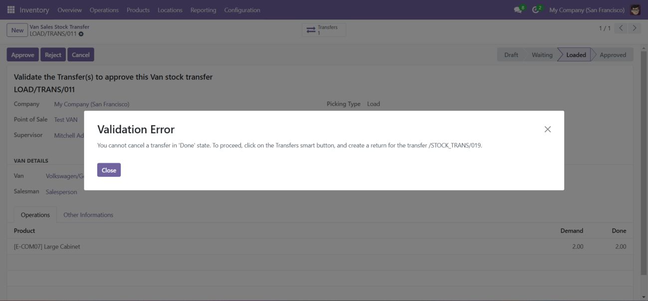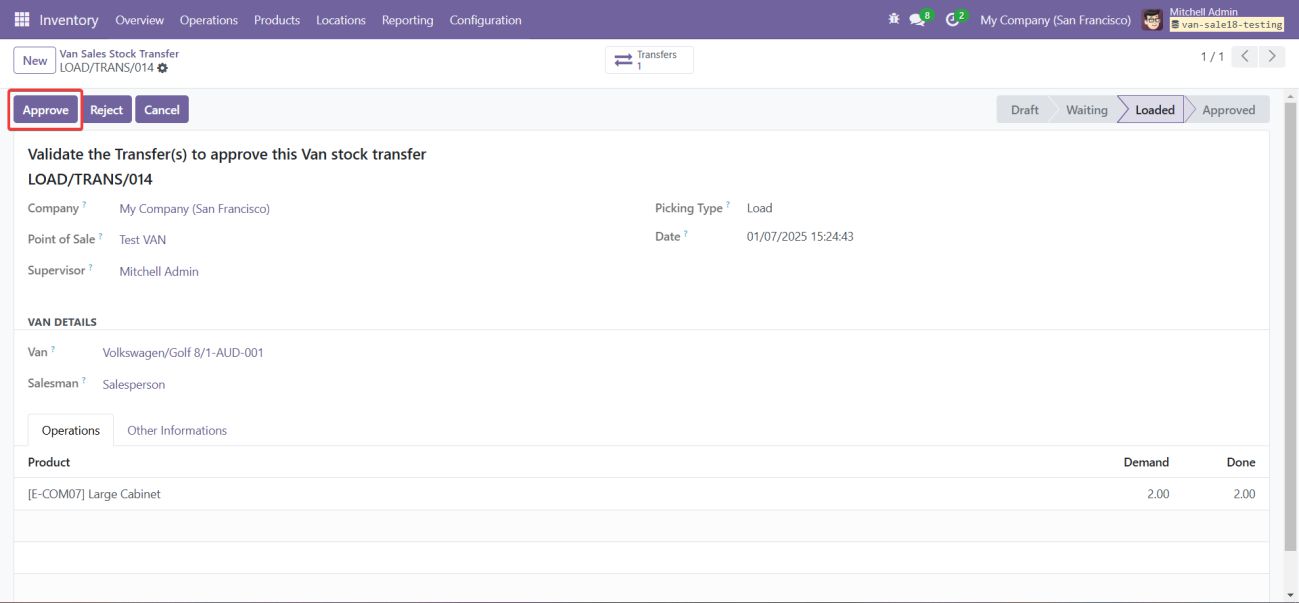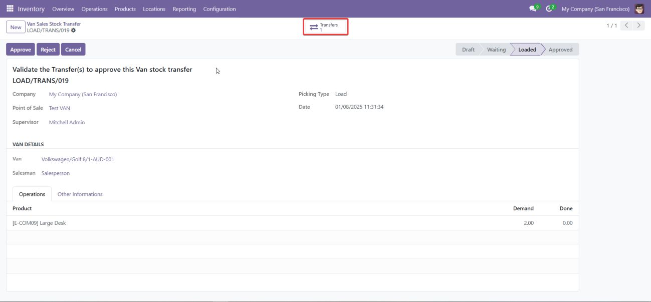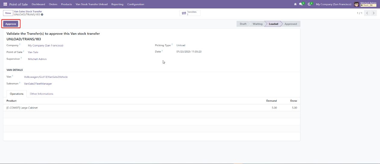 • The supervisor must review the unload transfer and click Approve to finalize the transfer of unsold products back to the warehouse.