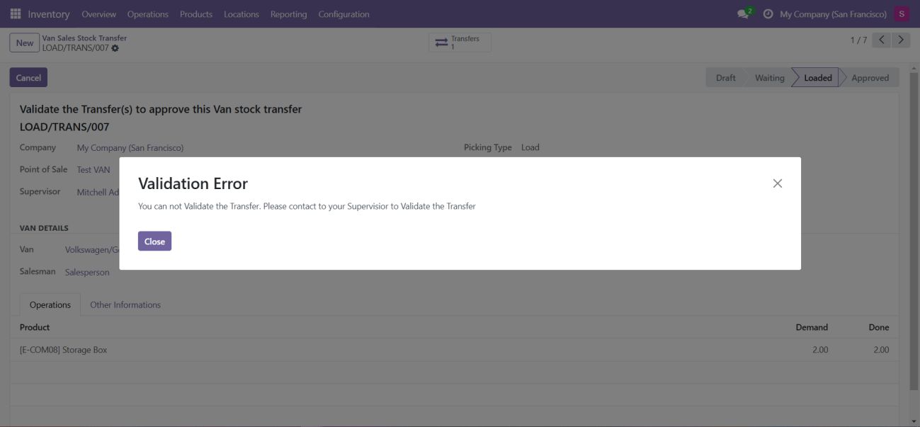 • This operation ensures that the van is properly stocked with products needed for the sales session.