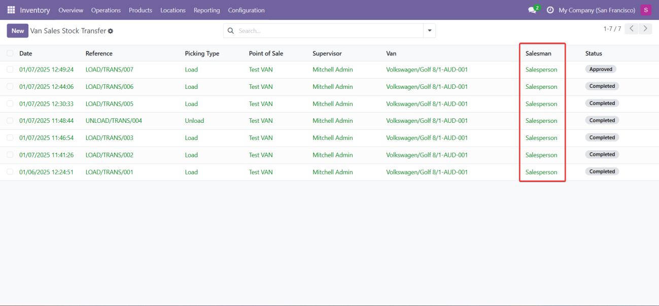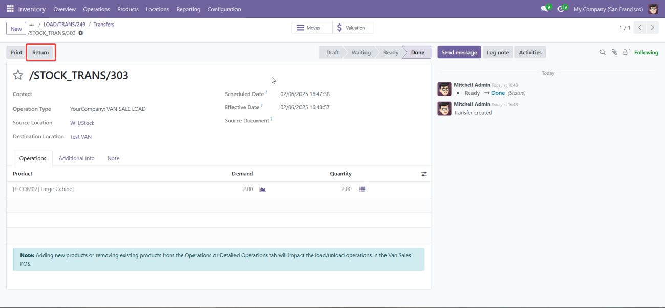 • The VAN_SALE_UNLOAD operation type handles the transfer of unsold products from the van back to the warehouse after the sales session is completed.