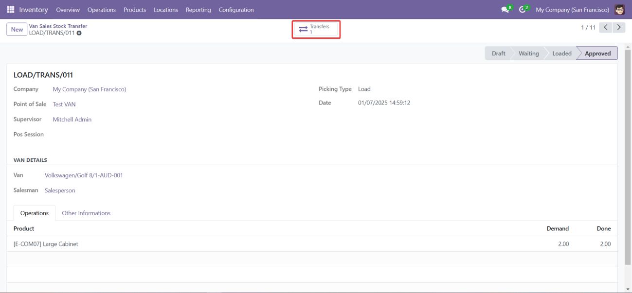 • The VAN_SALE_LOAD operation type manages the transfer of stock from warehouse locations to the van before the sales process begins.