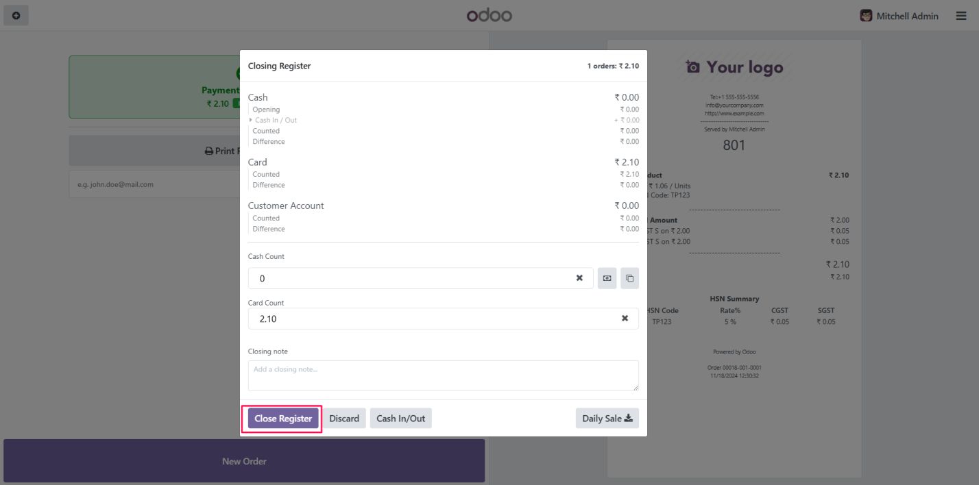 After completing the sales, close the POS session to finalize the transaction and update the inventory.