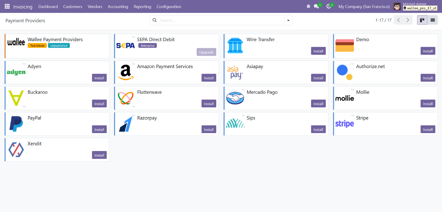 Screenshot 1: Payment Providers Listed in Odoo Backend