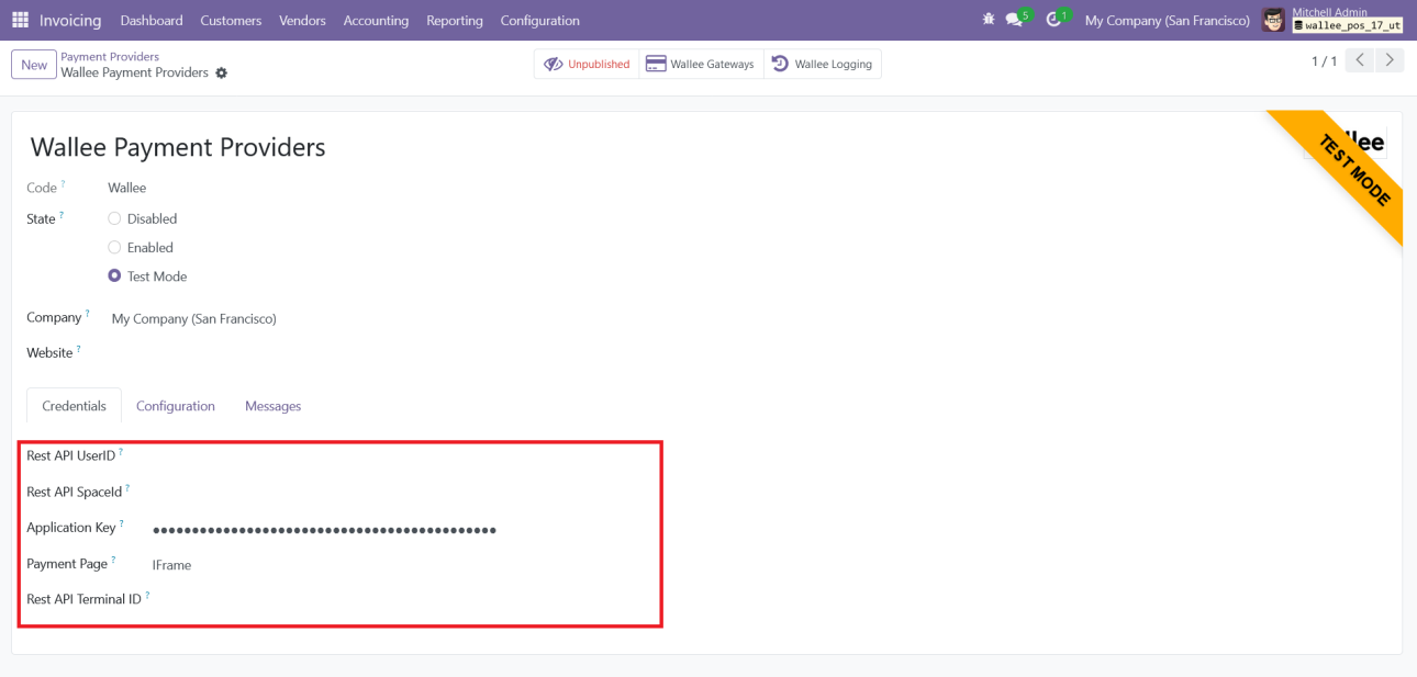 Screenshot 2: Odoo Backend Configuration of Wallee Credentials