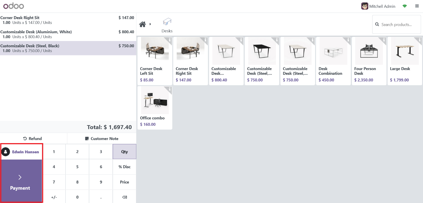 After the POS payment method configuration, go to the POS interface and select the desired products for the customer, choose an existing customer or create a new one, and then proceed to the payment screen.