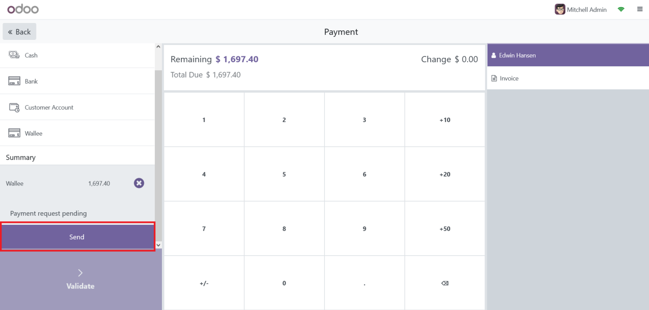 After selecting the Wallee payment method, you'll see the payment amount displayed along with a 'Send' button. Click on the 'Send' button to initiate the payment request and send it to the Wallee payment gateway.