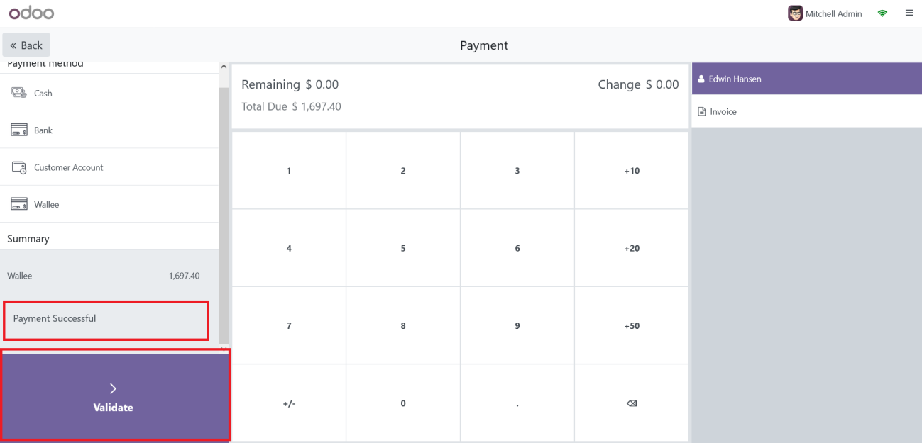 Upon successful payment, you can see the "Payment Successful" status displayed on the Odoo POS payment screen. If you haven't enabled the 'Automatically validate order' setting, the 'Validate' button will become active, allowing you to manually validate the order.
