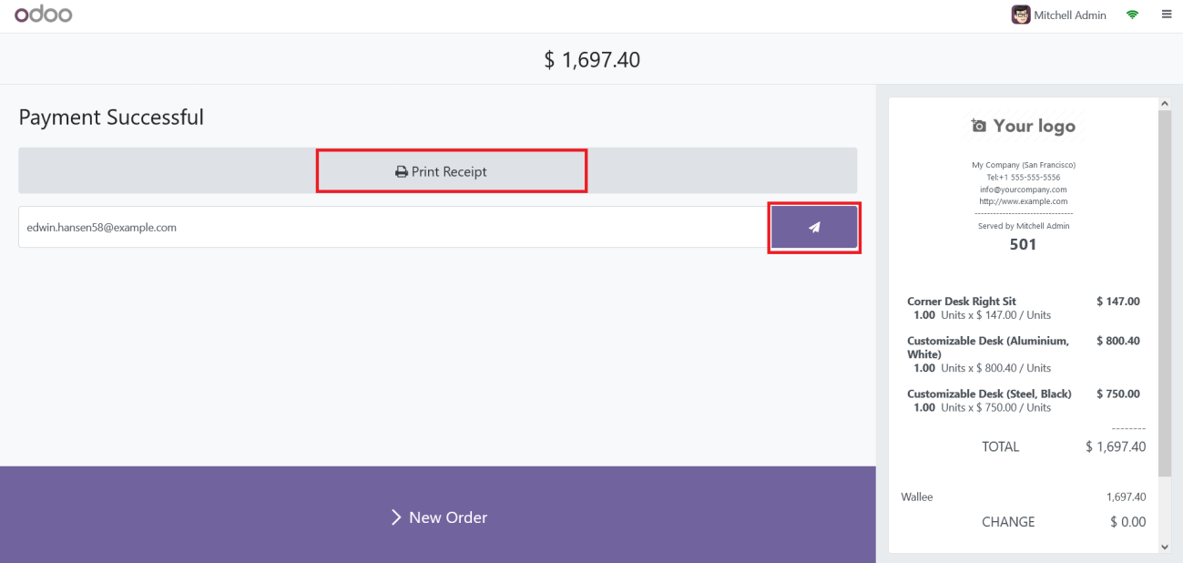 Once the order is validated, you can see this screen in Odoo. From here you can send and print the order receipt by clicking the paper plane icon button and the ‘Print Receipt’ button respectively.