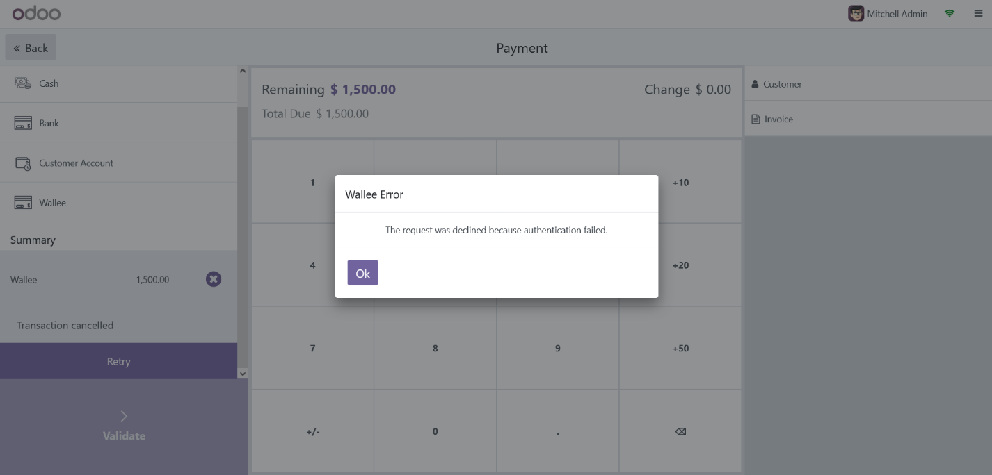 If the authentication is failed from Wallee for any reason, you can see the below error message in Odoo.