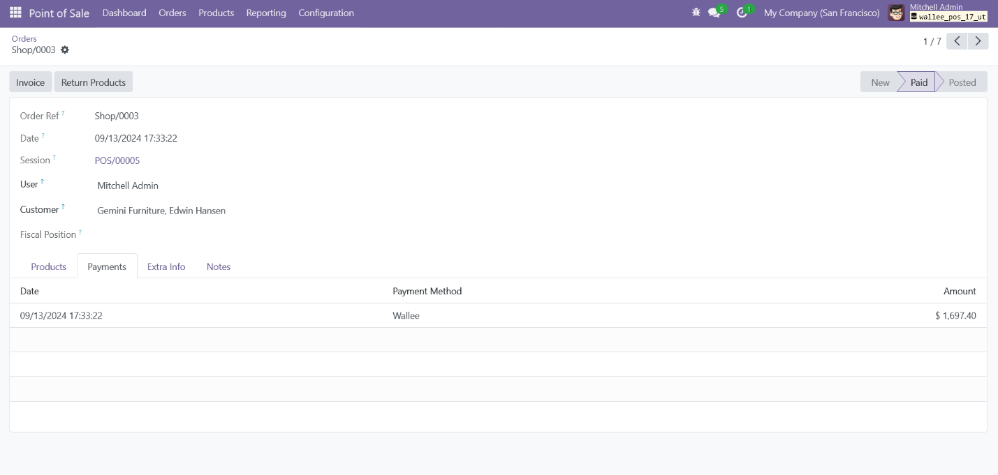 After a successful payment, order/transaction details will be recorded in Odoo under the Orders menu and in Wallee under the Transactions menu.