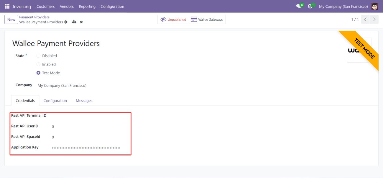 Screenshot 2: Odoo Backend Configuration of Wallee Credentials
