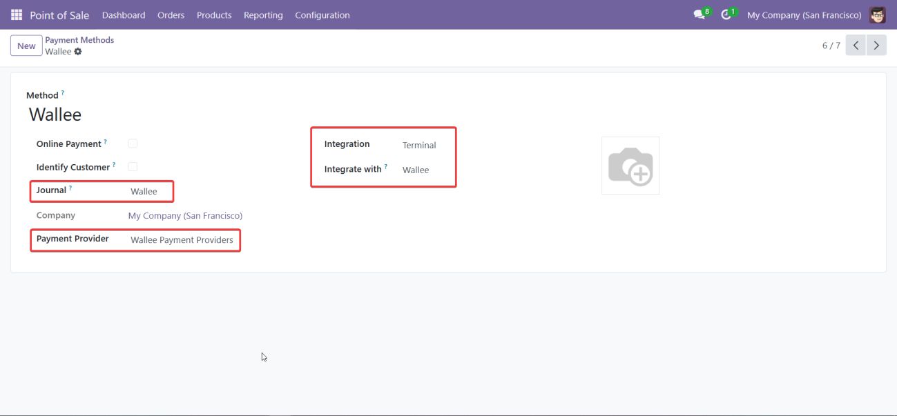 Then create a new payment method, naming it "Wallee." Assign a suitable journal for tracking Wallee transactions. Under the "Payment Provider" field, select "Wallee Payment Providers." Finally, choose the “Terminal" option from Integration and select "Wallee" from Integrate with option.