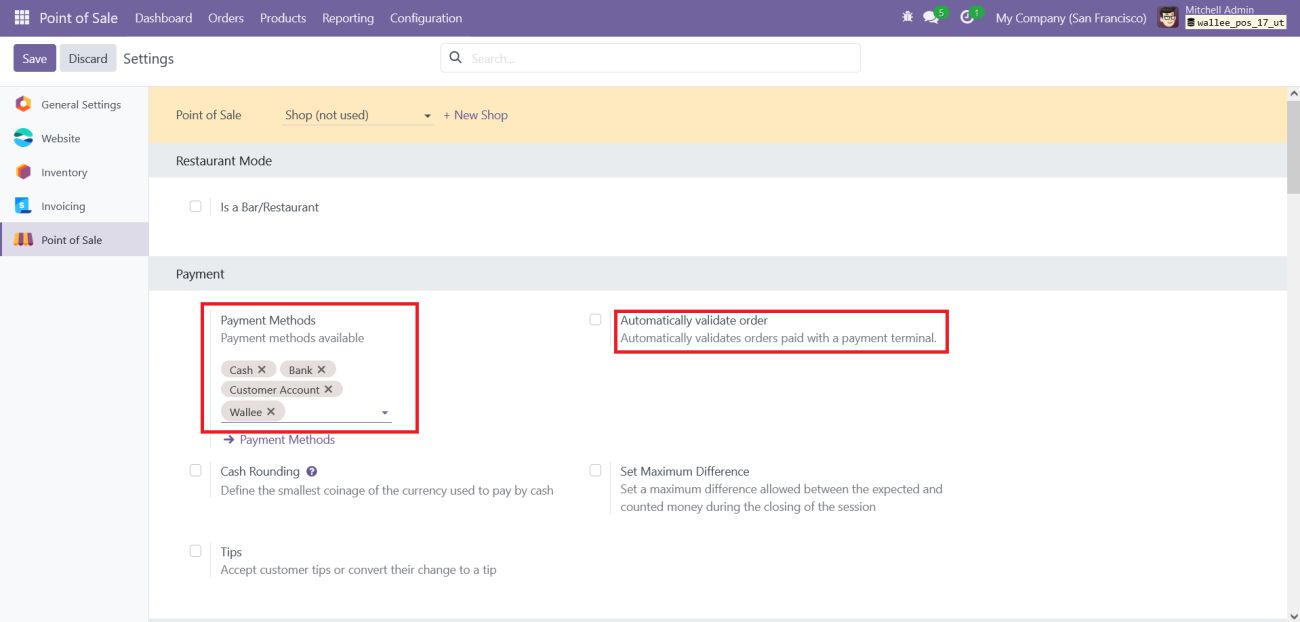 After creating the POS payment method, go to the Point-of-Sale settings, navigate to the Payment section, and add Wallee to the Payment methods available field.