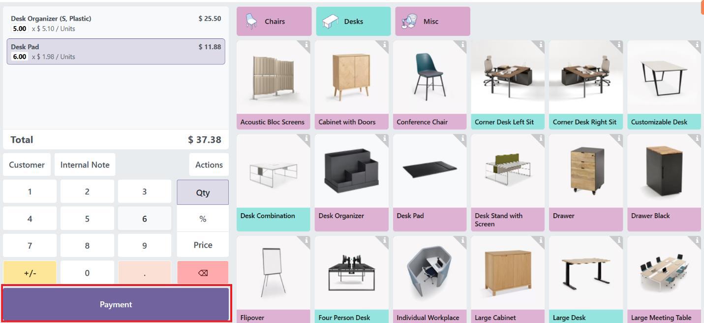 After the POS payment method configuration, go to the POS interface and select the desired products for the customer, choose an existing customer or create a new one, and then proceed to the payment screen.