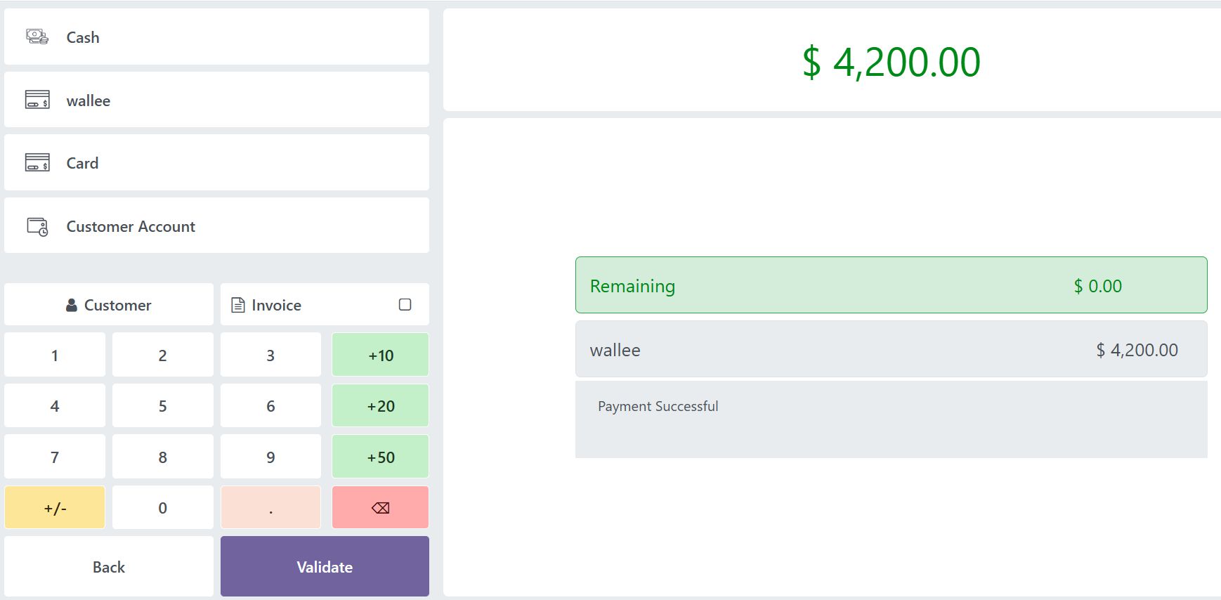 Upon successful payment, you can see the "Payment Successful" status displayed on the Odoo POS payment screen. If you haven't enabled the 'Automatically validate order' setting, the 'Validate' button will become active, allowing you to manually validate the order.
