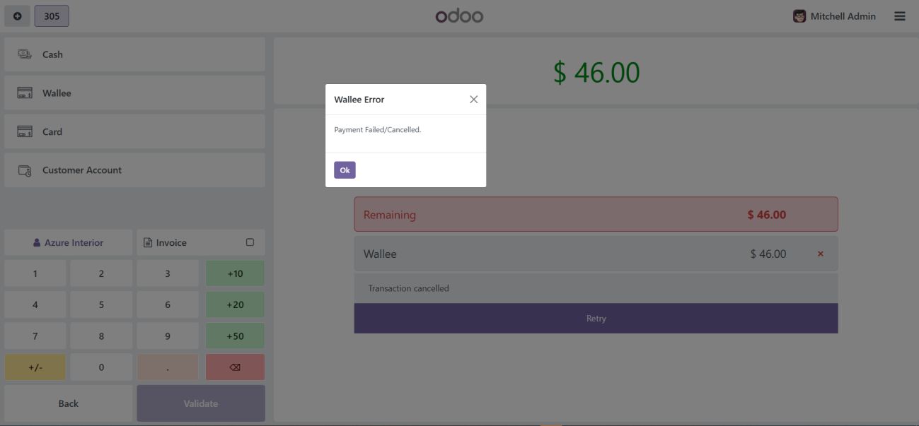 If the transaction fails in Odoo and is not cancelled from the Wallee terminal, you need to manually cancel it from the Wallee terminal.