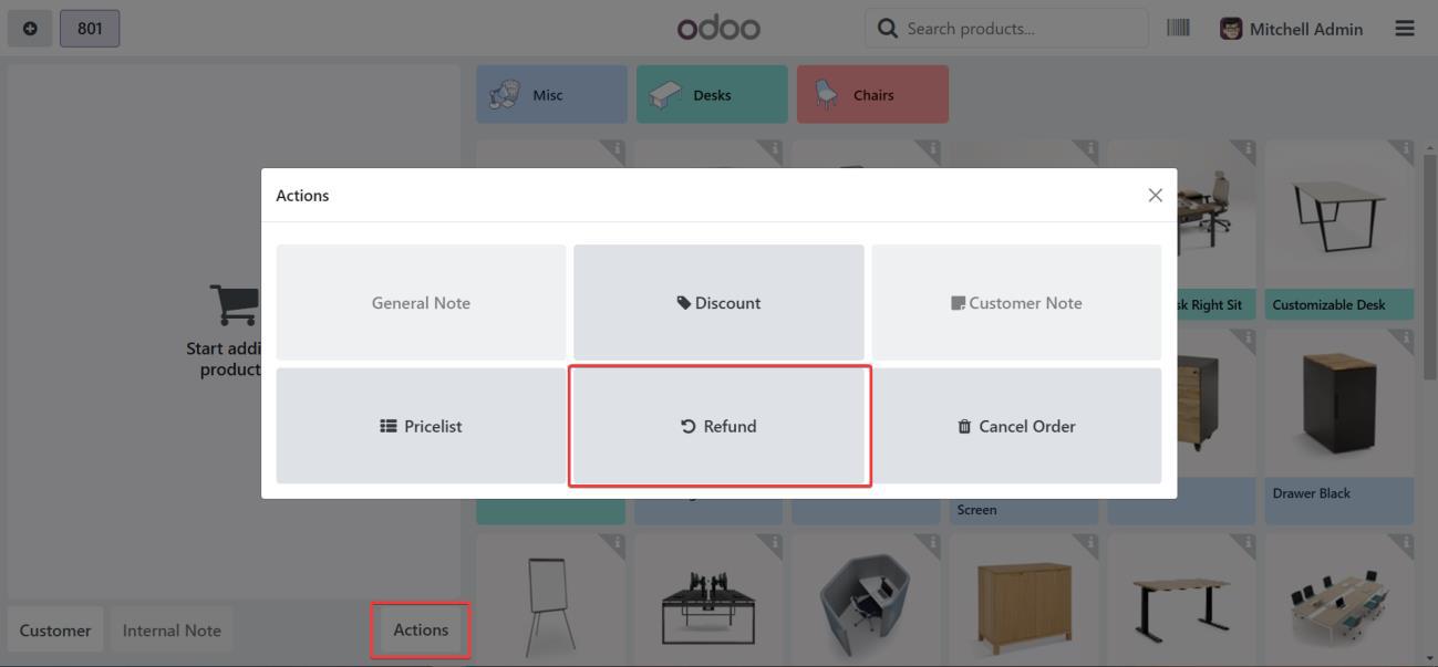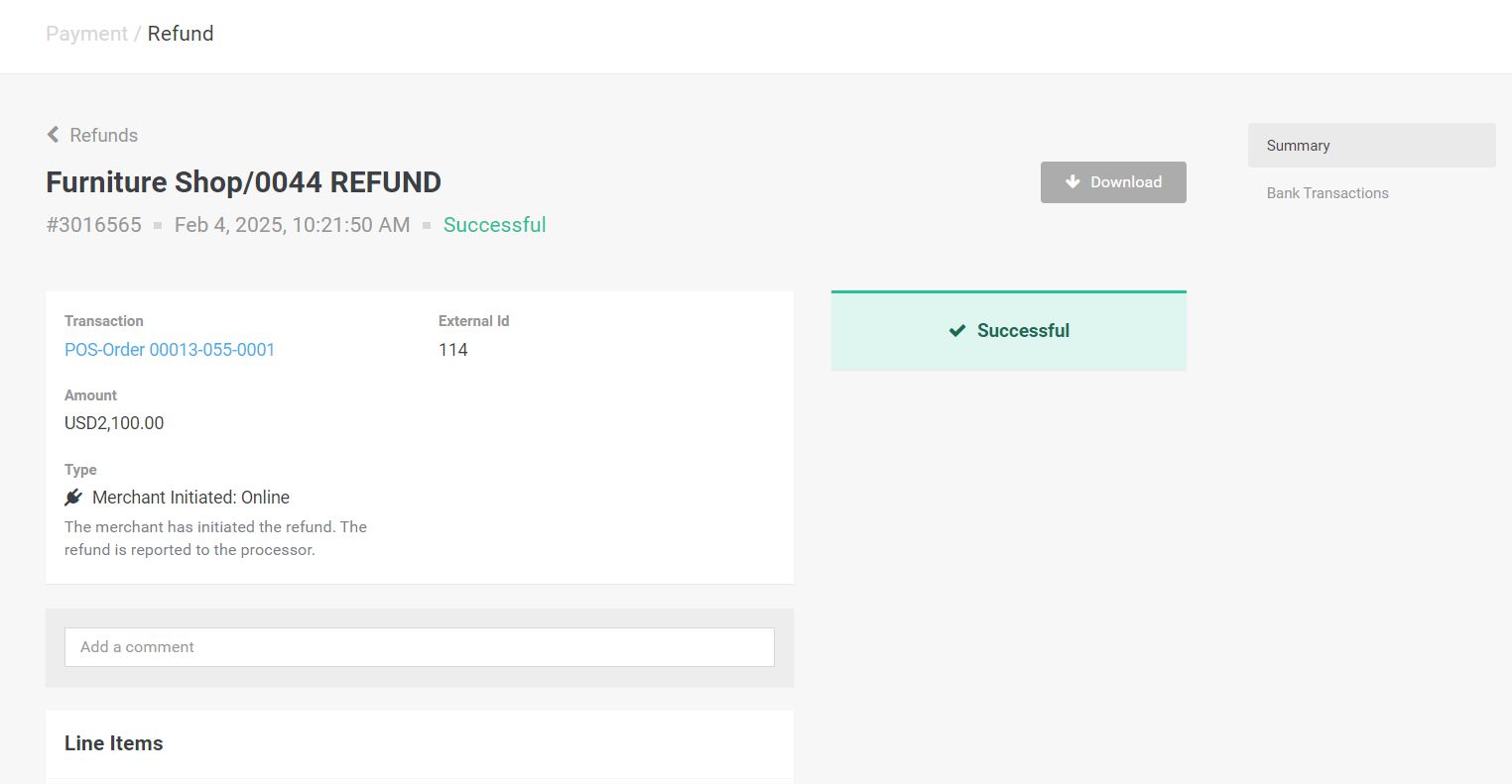 The refund through POS store can be done clicking on Actions button followed by clicking Refund button.