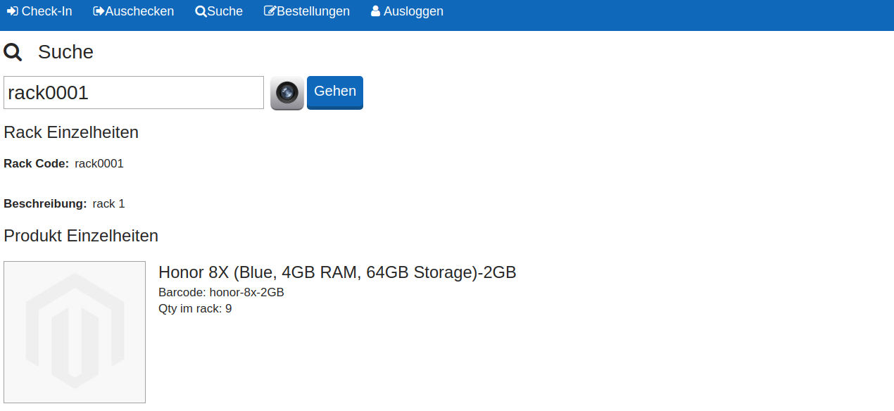 Enter Rack ID, product barcode, quantity to checkout and click checkout. When a product is checked out, warehouse as well as magento Inventory be updated. Click on camera icon to scan barcode. If using mobile device barcode accuracy depends on image quality. Supported barcodes: code128, code39, ean13, upc a.