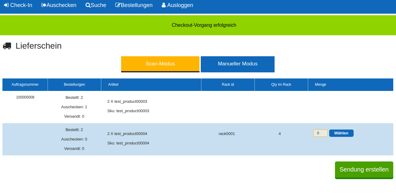 Click on ‘pack’ button to create shipment for an order in the order listing page. Use scan/manual mode to checkout products.