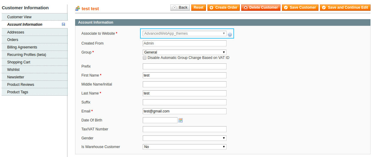 For creating a new webapp customer account, go to Admin > Customers > Manage Customers > Add New Customer. Associate customer to website ‘AdvancedWebApp_themes’.