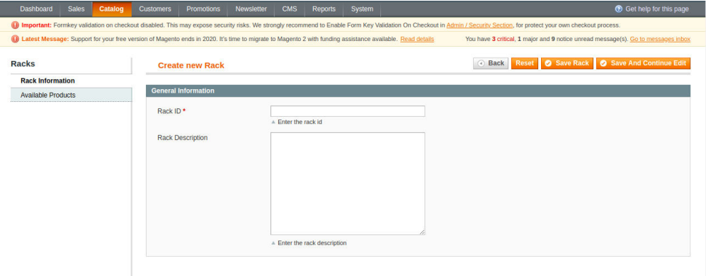 For Creating Rack, click on Catalog -> Warehouse Management -> Create New Rack. Enter Rack Id and Rack Description. If using Barcode for racks, enter barcode number of rack in the Rack ID field.